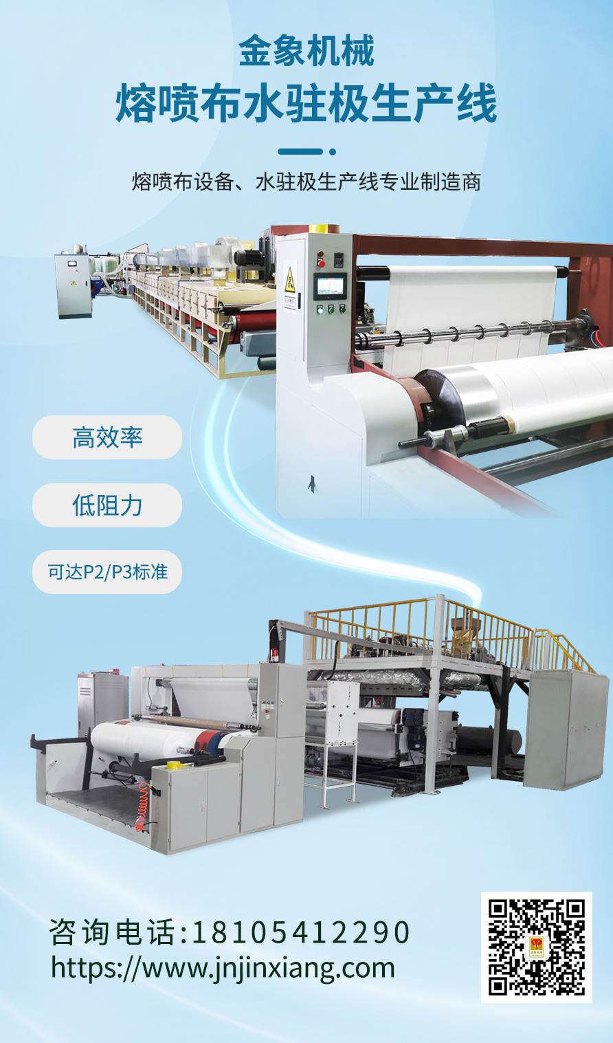 濟(jì)南金象機(jī)械設(shè)備有限公司是專(zhuān)業(yè)熔噴布設(shè)備,水駐極設(shè)備制造商,為客戶提供完整的熔噴布全自動(dòng)生產(chǎn)線解決方案。我司生產(chǎn)的水駐極設(shè)備處理后的熔噴布可以滿足高效低阻要求,使無(wú)紡布通透性更好,駐極體穩(wěn)定,吸附力強(qiáng),低阻力下,可以達(dá)到很好的過(guò)濾效率,滿足FFP2、P3+ / FK94 +等標(biāo)準(zhǔn)。